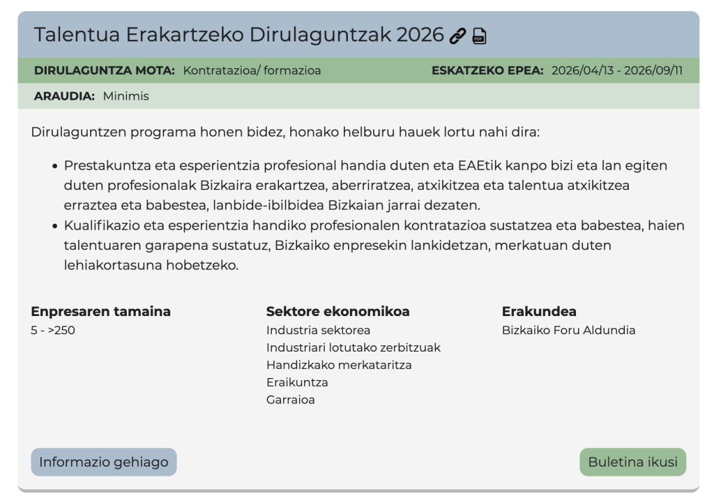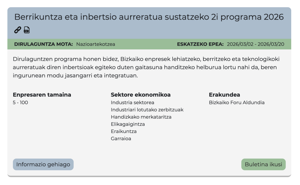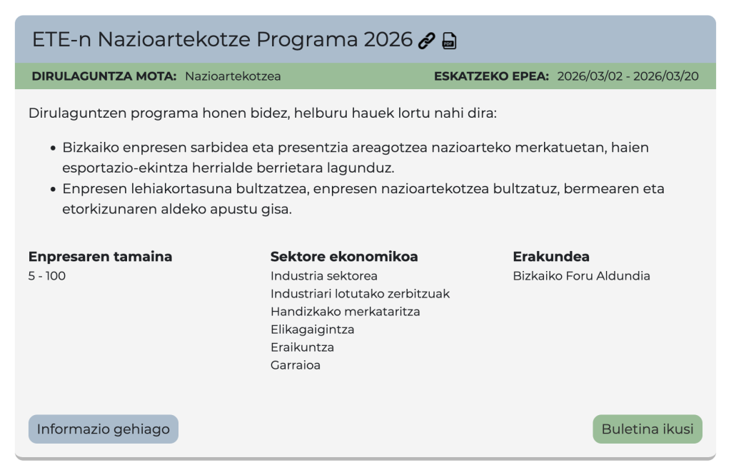 Ekimen hau batez ere Lea-Artibai eskualdeko industria, industriarekin lotutako zerbitzuak, handizkako merkataritza eta garraioko sektoreetako enpresei zuzenduta dago, eta aukerak identifikatzeko, proiektuak definitzeko eta finantzaketa egokia aurkitzeko laguntza pertsonalizatua eskaintzen du. Datorren asteetan, Bizkaiko Foru Aldundiaren 2I Berrikuntza eta inbertsio aurreratua sustatzeko Programa, ETEen Nazioartekotze programaren eta Talentuaren Erakarpenerako Programen baitako ekimenak diruz lagunduta izateko, laguntzak zabalduko dira.